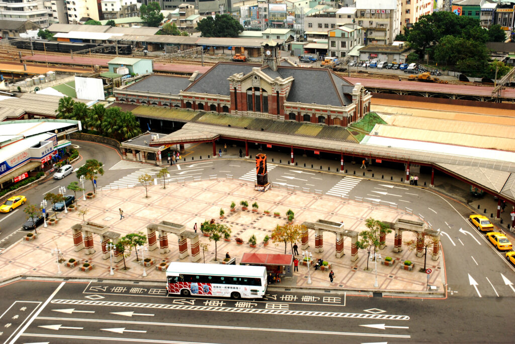 圖三/落成於 1917 年的臺中火車站,為仿西方文藝復興風格的紅磚建築。圖為車站於 2016 年鐵路高架化前的樣貌。(影像來源/國家文化記憶庫 2.0)
