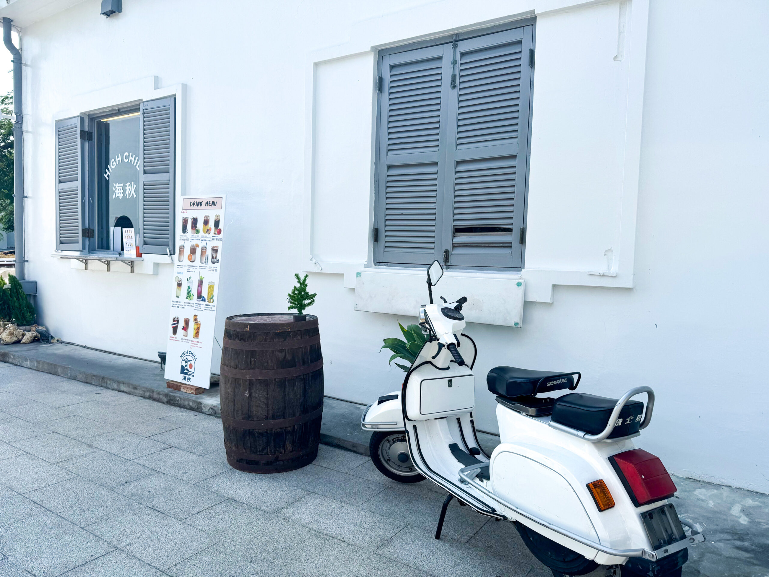 除了提供餐飲服務,海秋咖啡也從空間陳列、風味詮釋回應場域精神。面對古蹟建築,團隊並未選擇大幅度更動空間設計,而是運用閒置的窗面創造出視覺端景——承載著旅行意象的白色偉士牌機車停放於窗前,恰與屹立百年的燈塔產生對話,一動一靜之間,反映出歷史場域擁抱想像力的開放姿態。