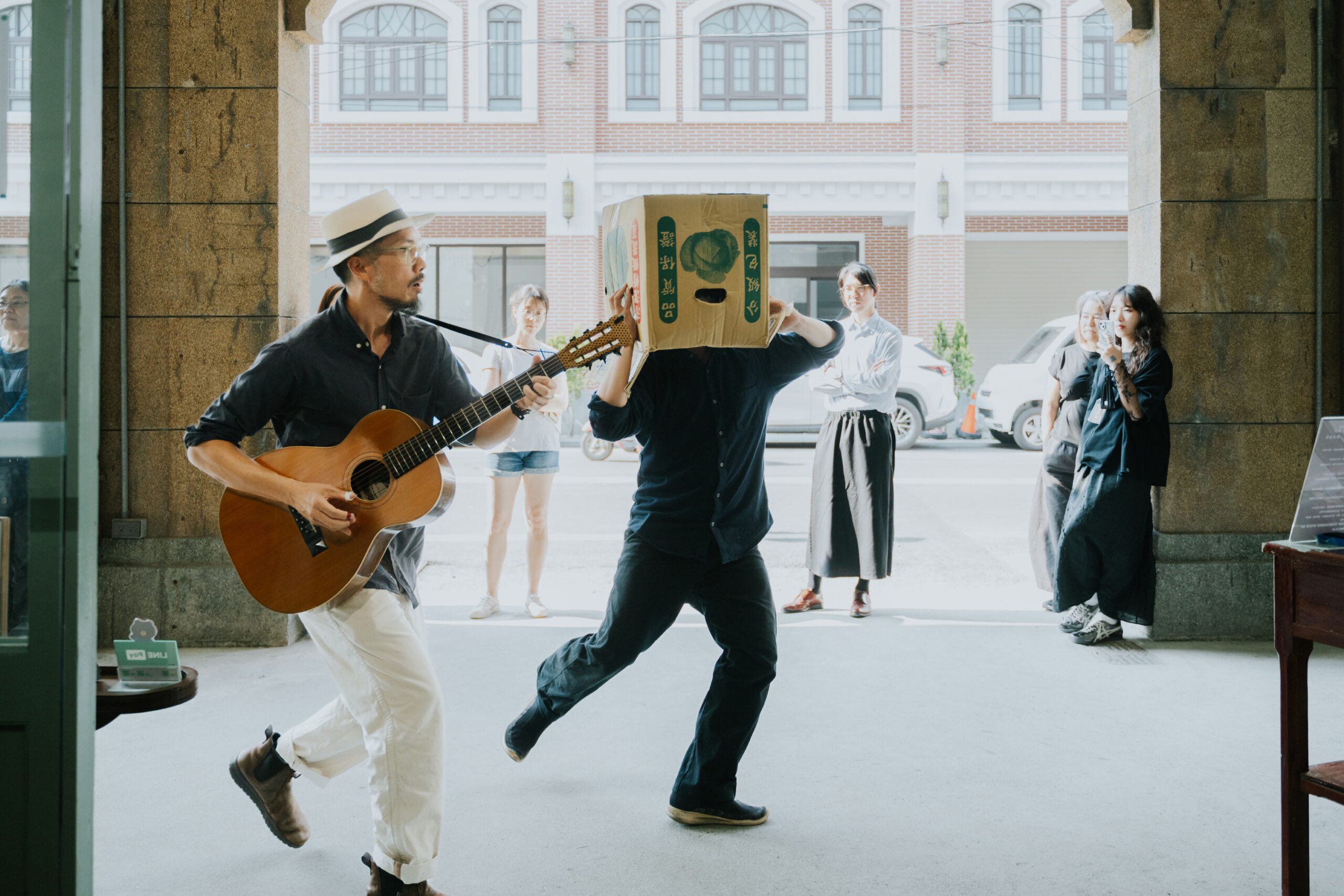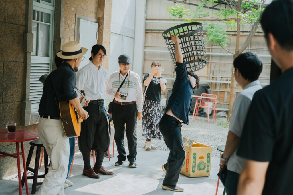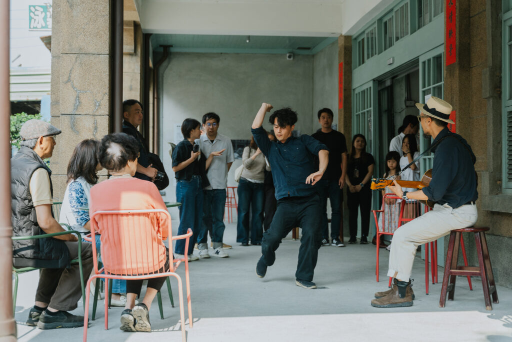 帶著如此叩問,在第一幕聲景開始之前,民族路側的騎樓下便擦亮了微小的即興火花。藍調草根民謠唱作人 David Chen 的吉他樂音流淌,編舞家許庭瑋則背負菜籃與紙箱、忙碌地四處遊移,彷彿重現了過往鹿港市街繁榮的景象;而行經人車皆在無意間成為佈景,讓當代藝術與日常交會。