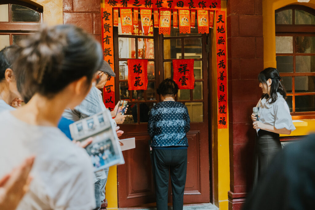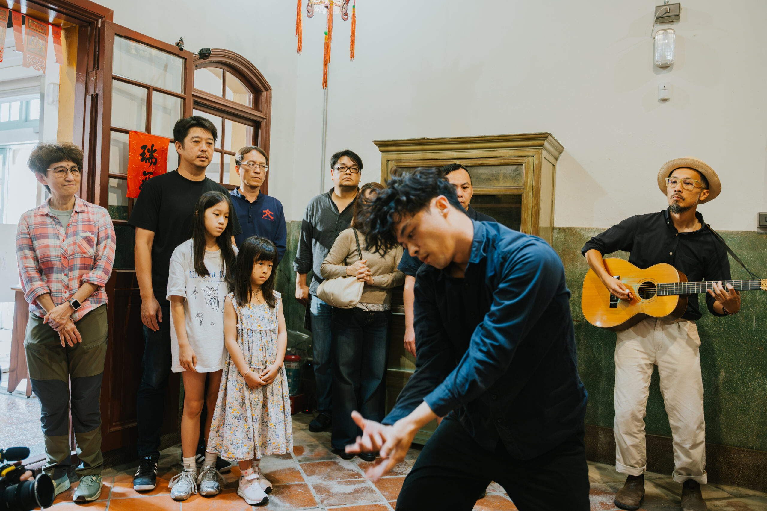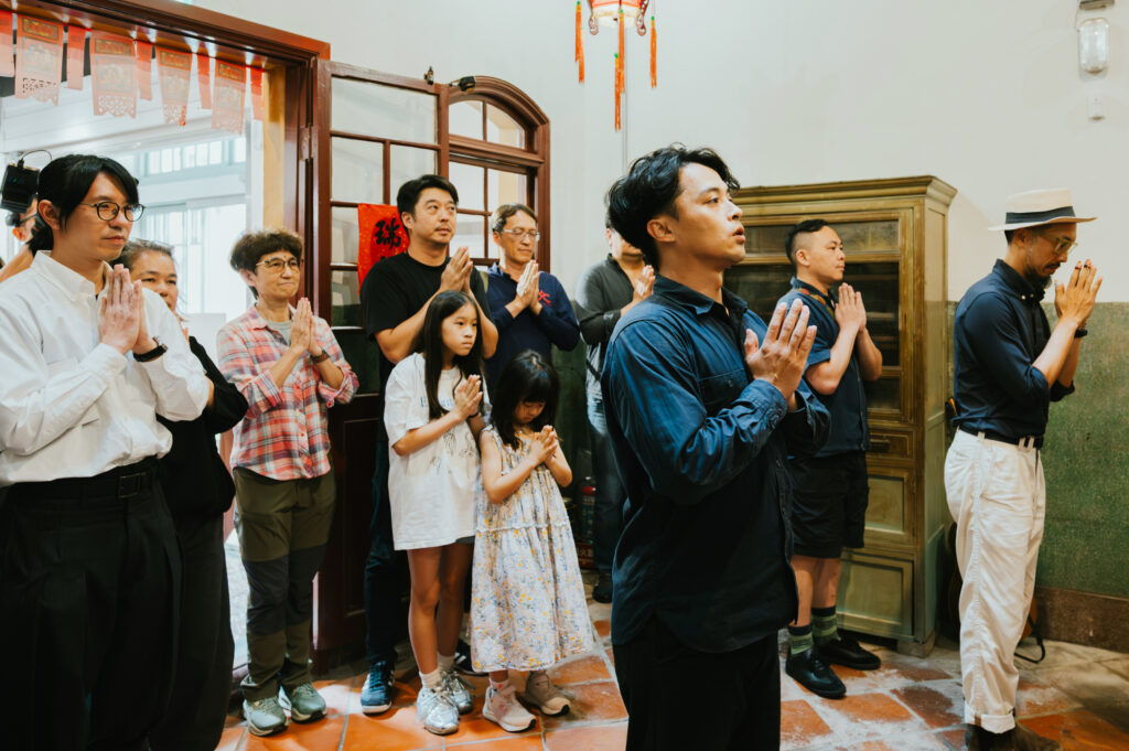 當屋外的熱鬧暫歇,引領眾人走入演出場域的,是許家阿嬤、許蒼澤攝影家夫人-施秀香女士。伴隨著輕輕的叩門聲,阿嬤以數十年如一日的姿態推開木門,舞蹈說書人許庭瑋則帶領觀眾,在演出前向許家祖輩敬拜致意——《綴》的旅程於此正式展開。在舞者的引導下,David Chen 的藍調帶著朝陽的酥鬆慵懶,而觀眾也在氤氳線香中,走進了許家人數十年來沉澱的生活氣息。
