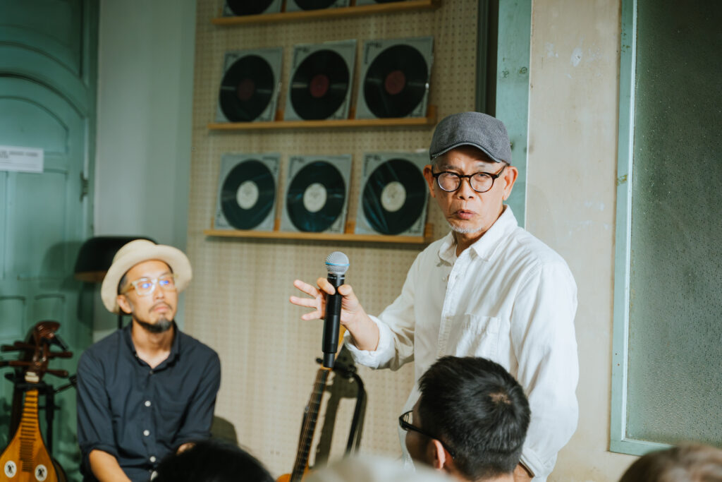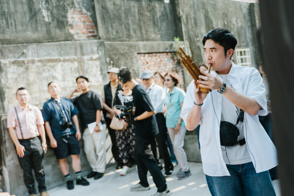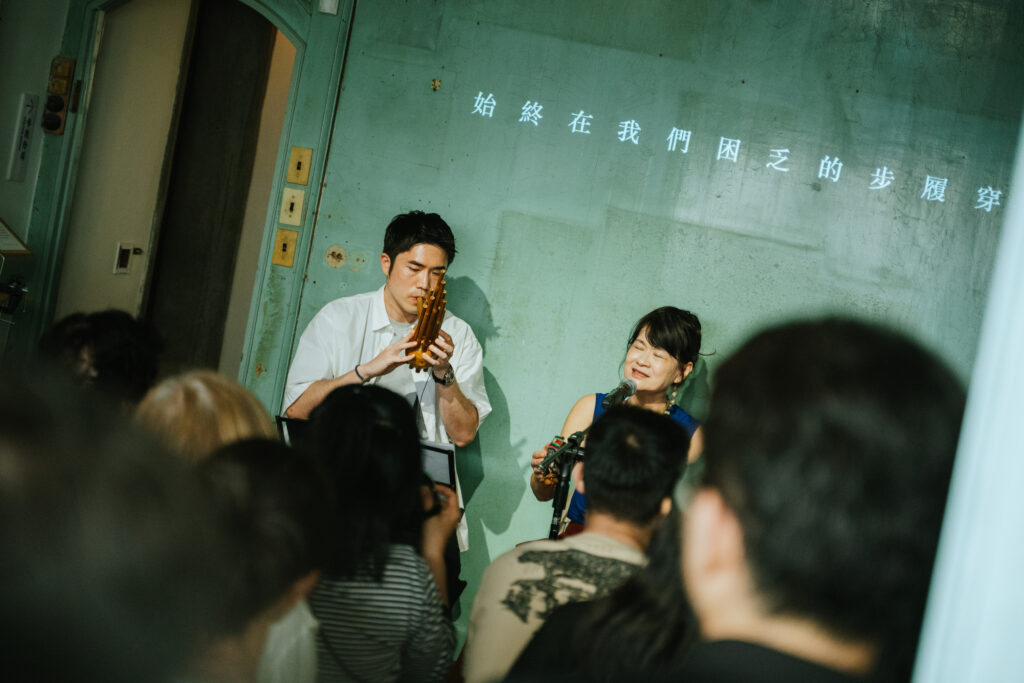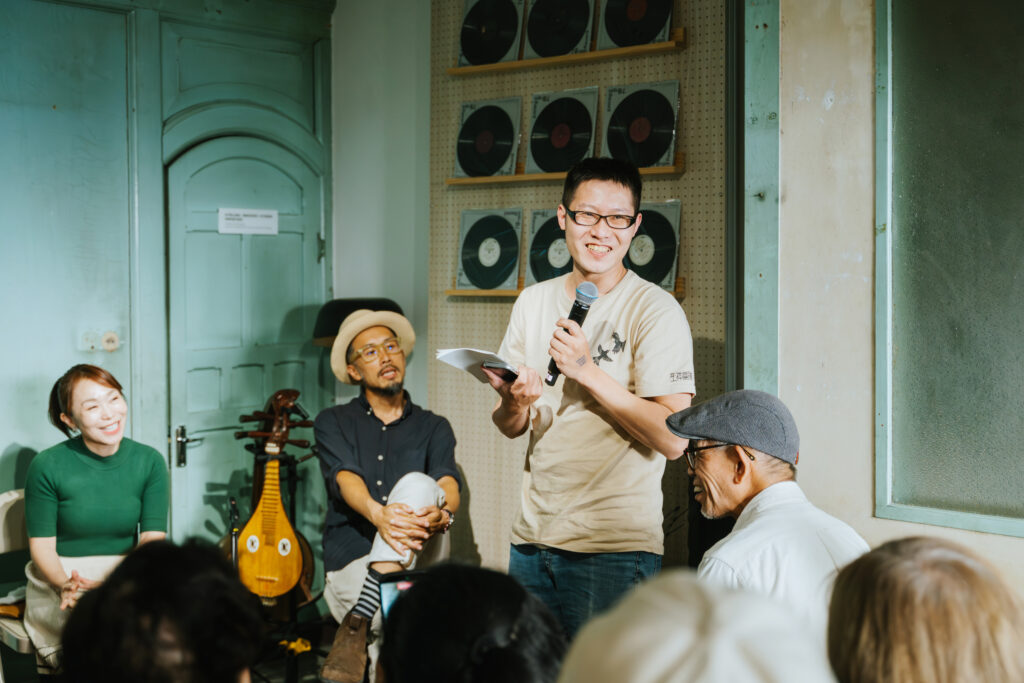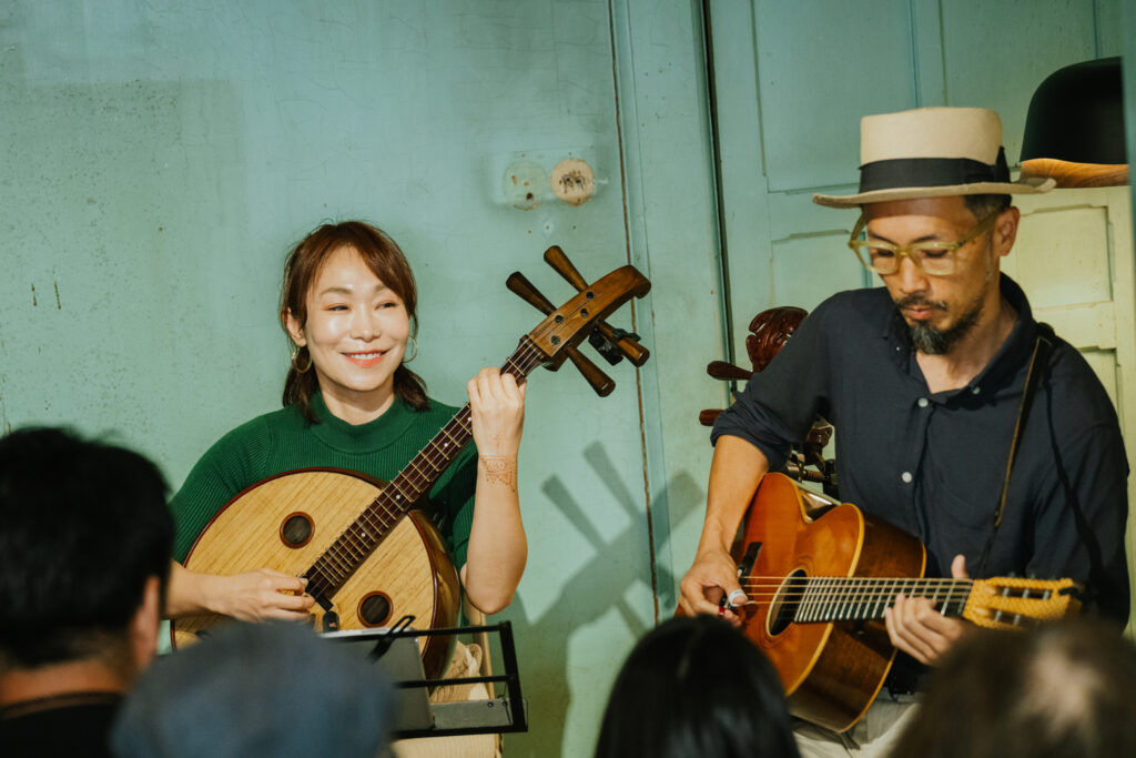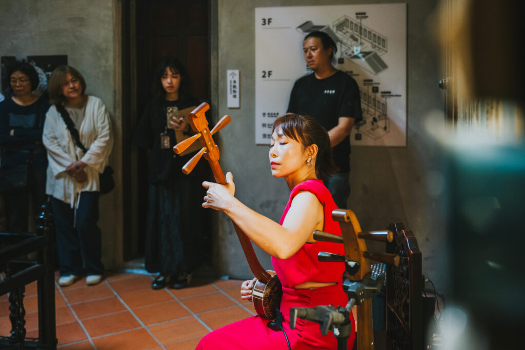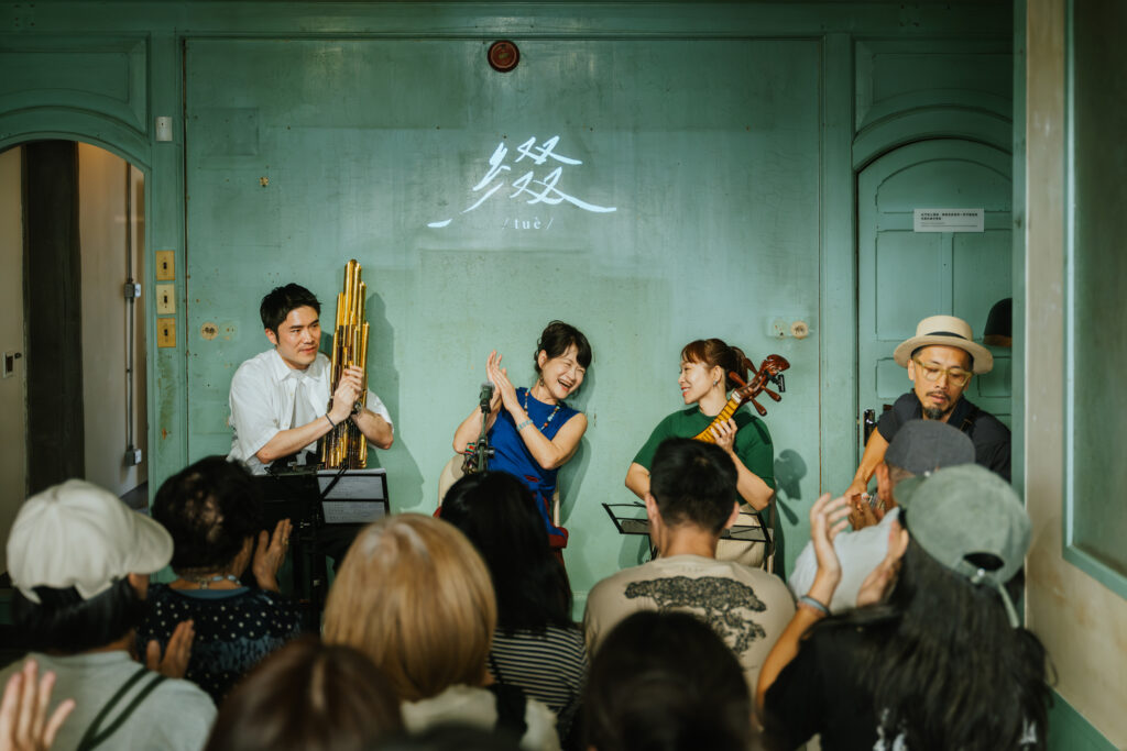 循著動線回到昔日許家舉辦家庭音樂會的「頭前樓」,微劇場迎來了最終幕。詩人歌手羅思容與三位音樂家在此齊聚——彈撥音樂家陳崇青換上了中阮與柳琴,與 David Chen 的木吉他、楊智博的笙共同勾勒出飽滿聲景。