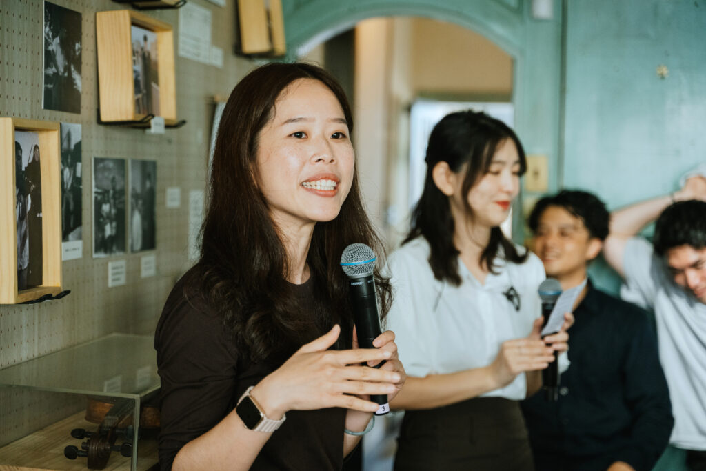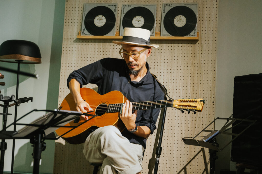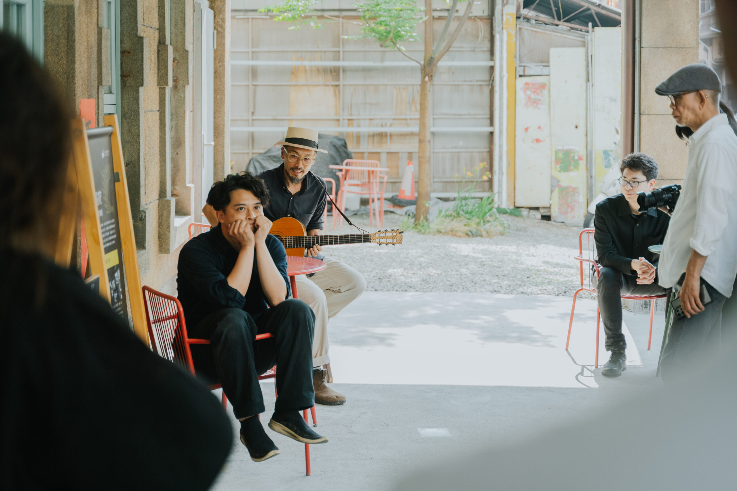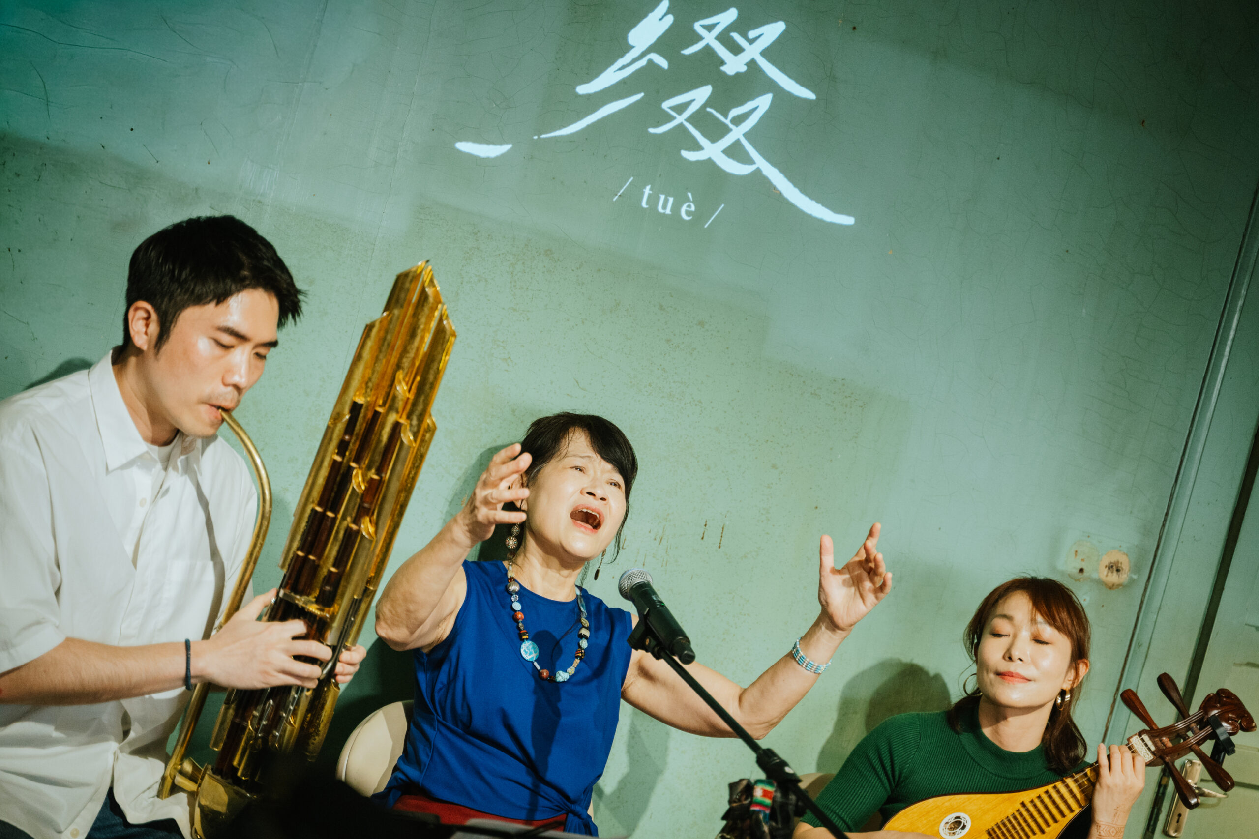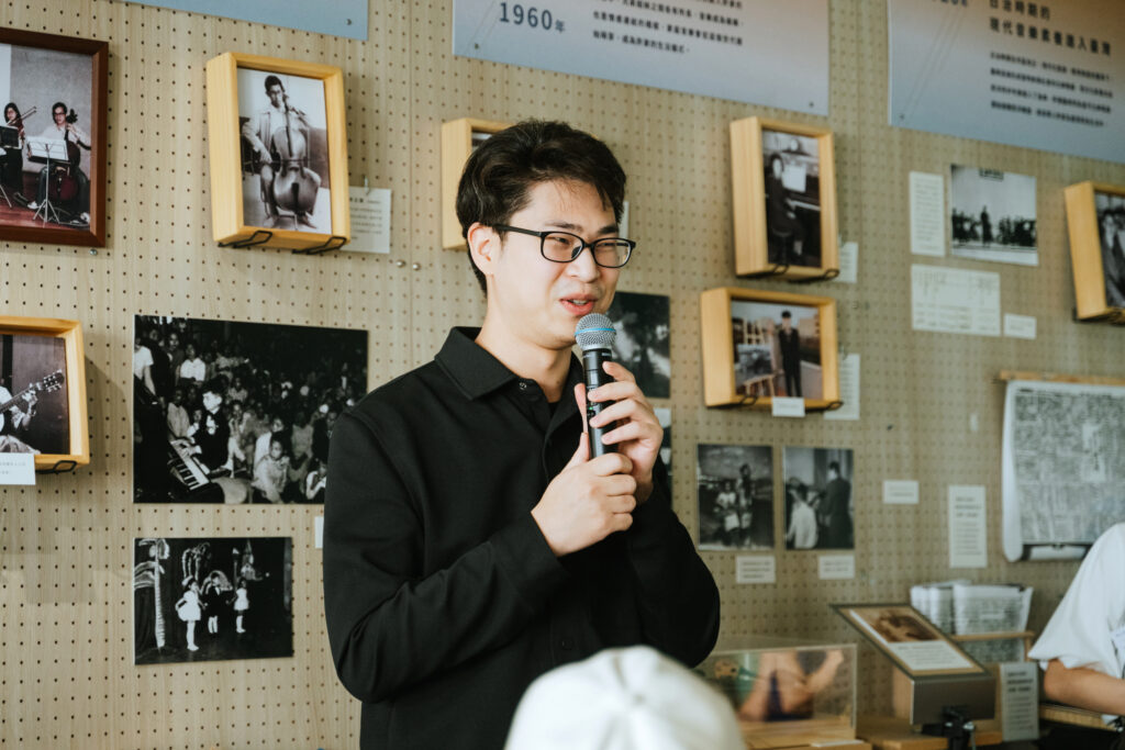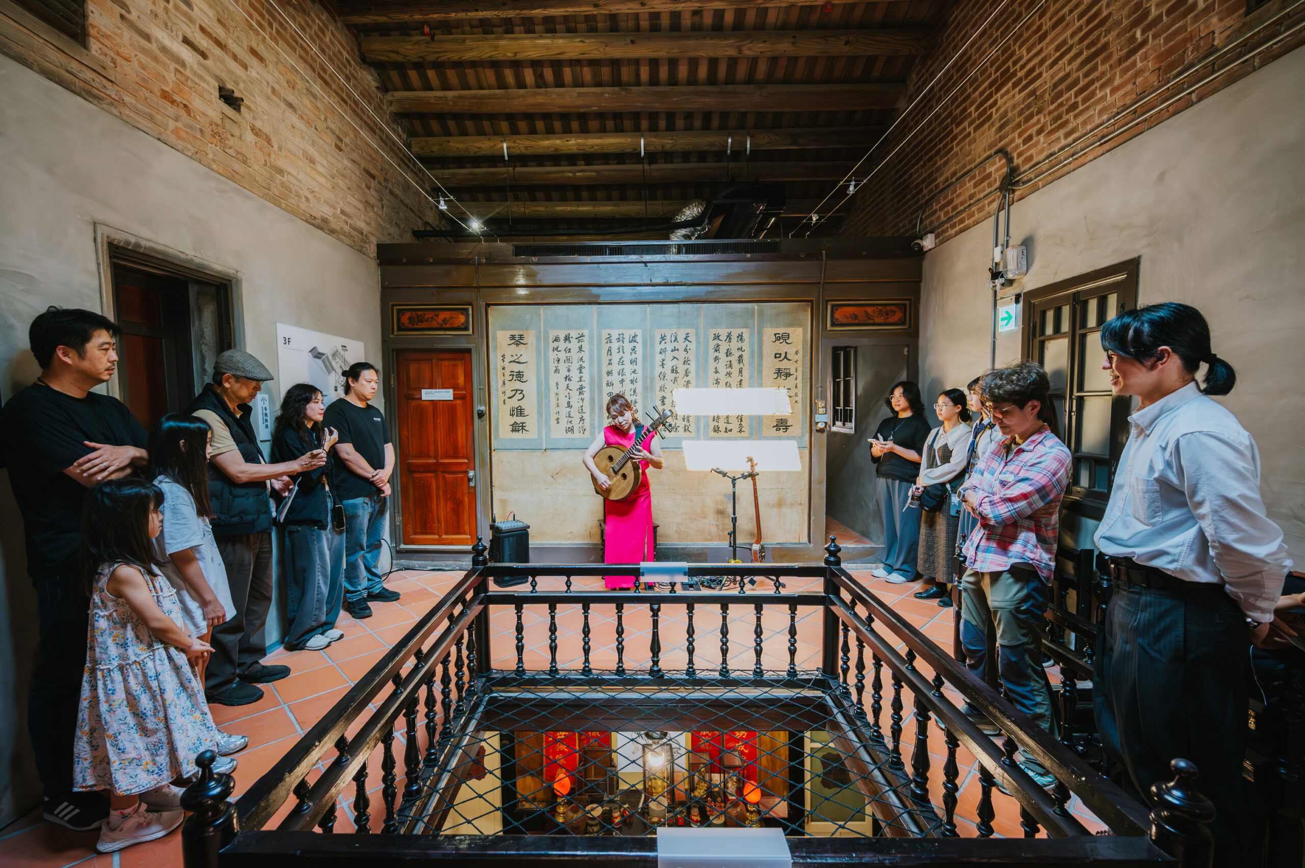 循著動線回到昔日許家舉辦家庭音樂會的「頭前樓」,微劇場迎來了最終幕。詩人歌手羅思容與三位音樂家在此齊聚——彈撥音樂家陳崇青換上了中阮與柳琴,與 David Chen 的木吉他、楊智博的笙共同勾勒出飽滿聲景。