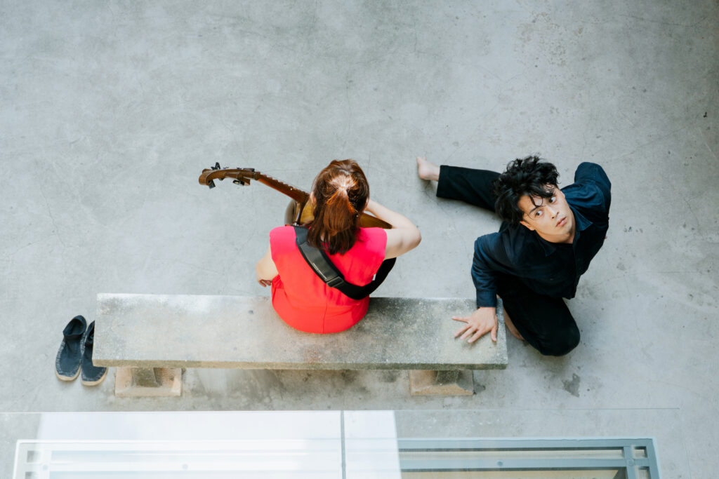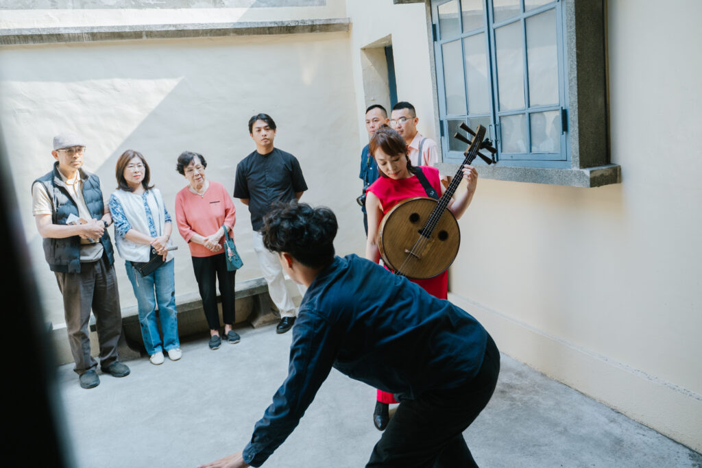 木吉他的聲音淡出,彈撥音樂家陳崇青的三弦獨白響起,中廳二樓的壁畫作品於是成為演出背景,而陽光灑落的樓井區域,也自然展開為環形的劇場舞臺。在略具現代感的配樂伴奏下,傳統樂器的節奏融入了當代脈搏,勾勒出昔日家人相聚的熱鬧溫馨;曲調一轉,藝術家懷中的樂器換成了中阮,表演動線也從壁畫前緩緩流動至戶外露臺。揉合今昔的音律與舞者的身體語彙相互試探、拋接,每一個音符的停頓與肢體張力,皆由老屋當下的氣息自然催化產生。