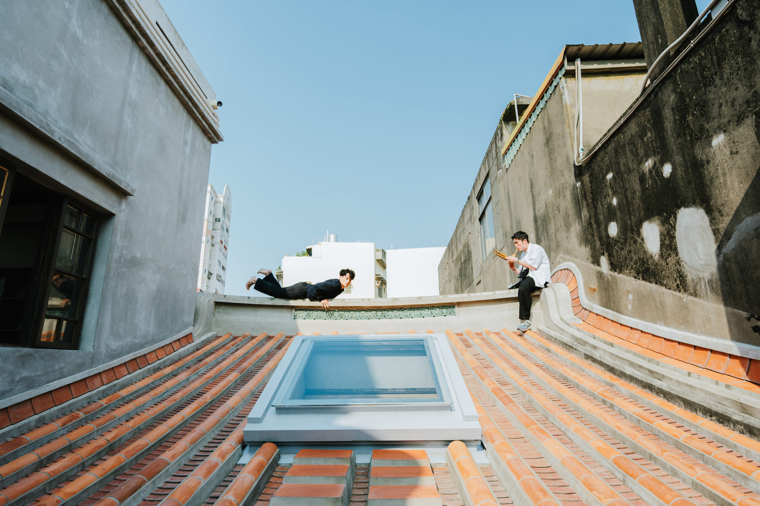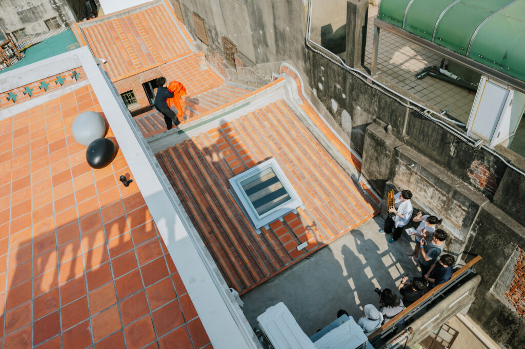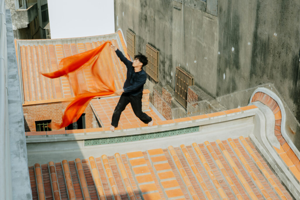 踏上漢式街屋的頂層磚坪,笙演奏家楊智博正跨坐於時代相會的屋脊之上。赤腳登上紅瓦的舞者在樂聲中伸展、攀爬,以肌膚感受著日光曝曬後的瓦片溫度;而笙音則悠悠回應著鹿港的海風、市街的熙攘,以及晚霞的光影流動。舞步流轉間,透著偏光色澤的橘黃色的薄紗驀然展開,既呼應著朝暾夕照的迷人光彩,也輕柔地拂過了長源醫院的流金歲月。